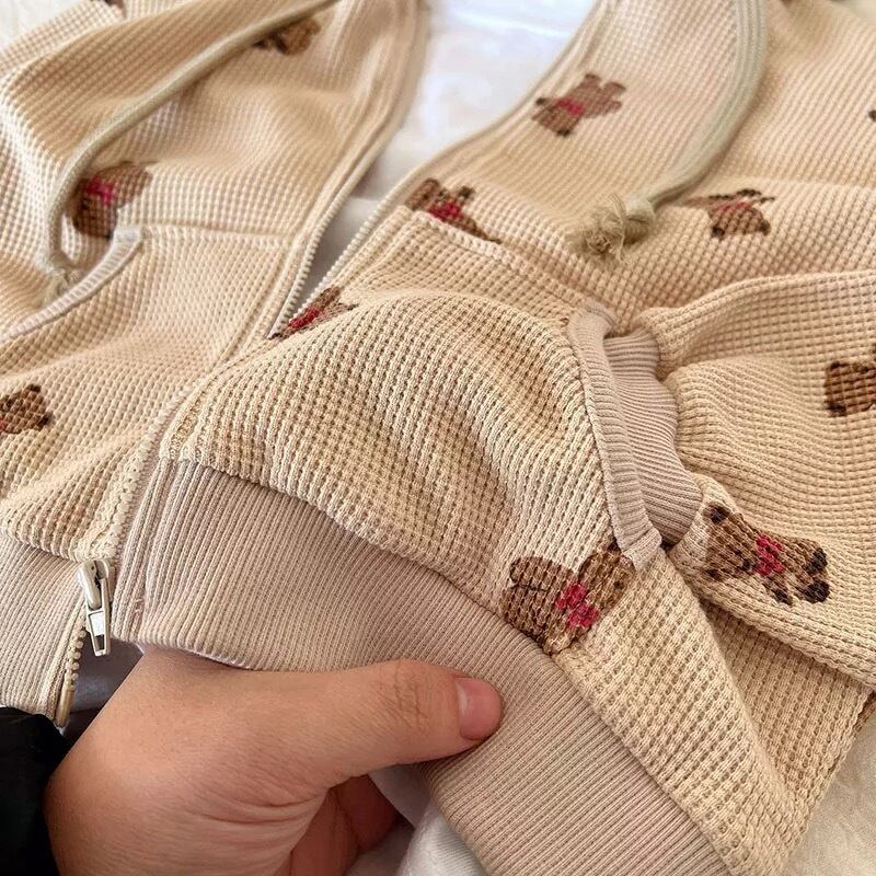 ワッフル素材特有の凸凹生地にみんなに愛されるくまちゃんプリントもとってもかわいいデザイン♪